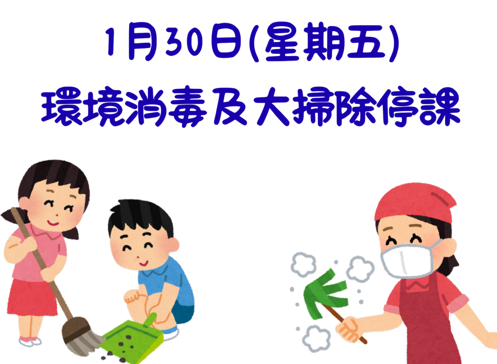 為維護幼兒及教職員健康安全,本園將於1/30日(星期五)進行全園環境消毒及大掃除作業。