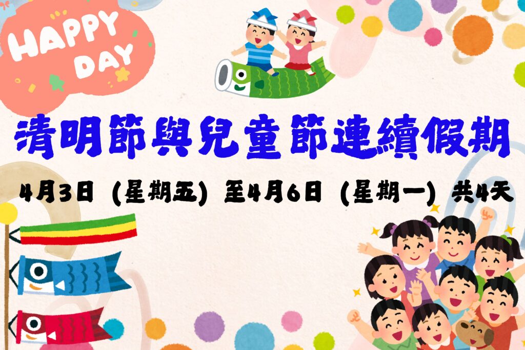 清明節與兒童節連假~ 4/3(星期五)~4/6(星期一)共4天假期